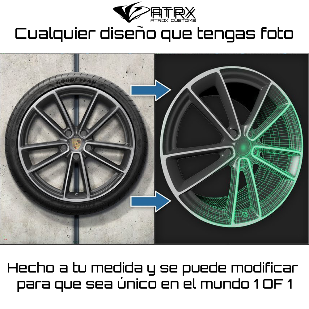 Podemos realizar cualquier diseño que encuentres en internet, nuestro diseñador en 3D se basará en la imagen que tengas y te los hará exactamente como los quieres pero en las medidas para tu auto y en el acabado que los quieras.